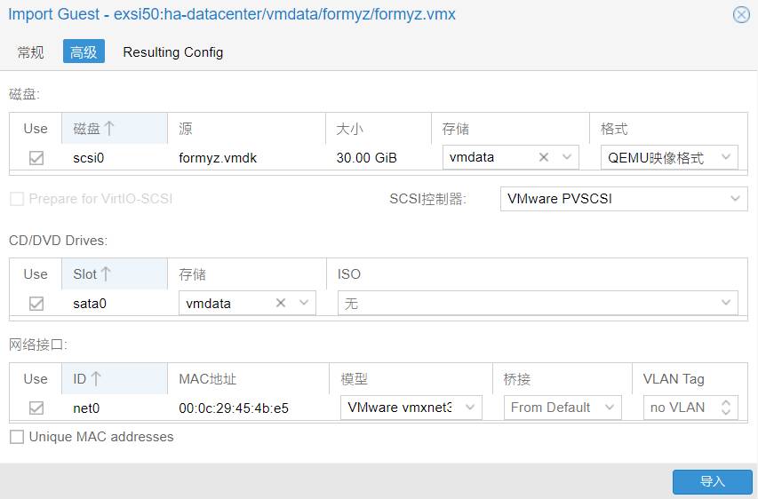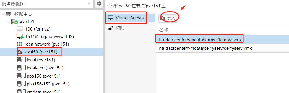 根据文件的命令来区分各源虚拟(比Proxmox VE以虚拟机ID来标识直观),选择欲迁移的虚拟机,直接单机顶部菜单按钮“导入”,