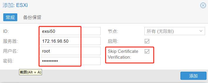 Proxmox VE 8.2 Web管理后台,单击子菜单EXSi,输入相应的信息并勾选“跳过验证”,如下图所示。
