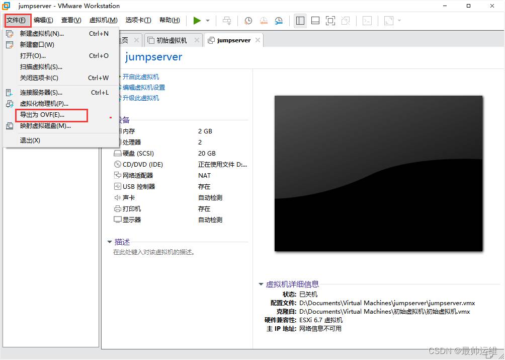 先点击要迁移的虚拟机,再导出,否则 ”导出作为OVF“ 选项会是灰色: