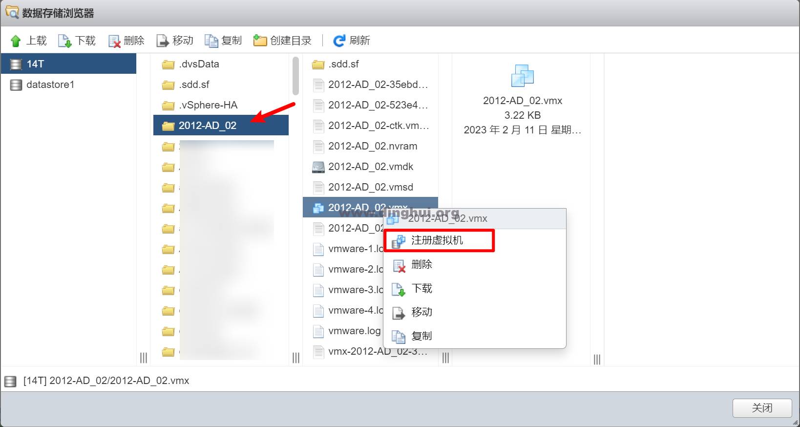 目标存储已经能找到该文件夹,右键.vmx文件,注册虚拟机。