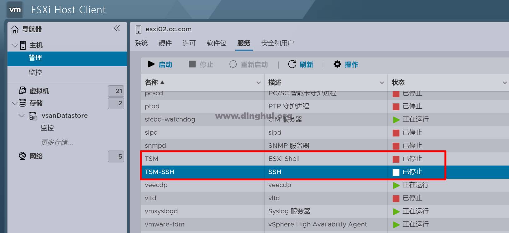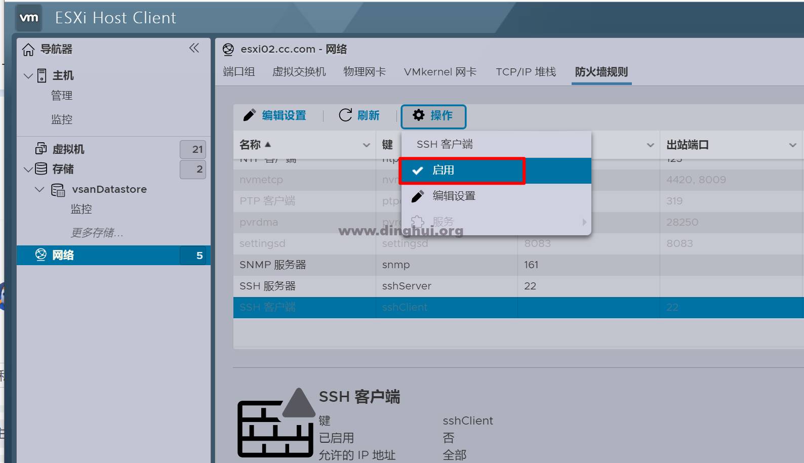 ESXi web页面:网络—->防火墙规则—->ssh客户端—->启用