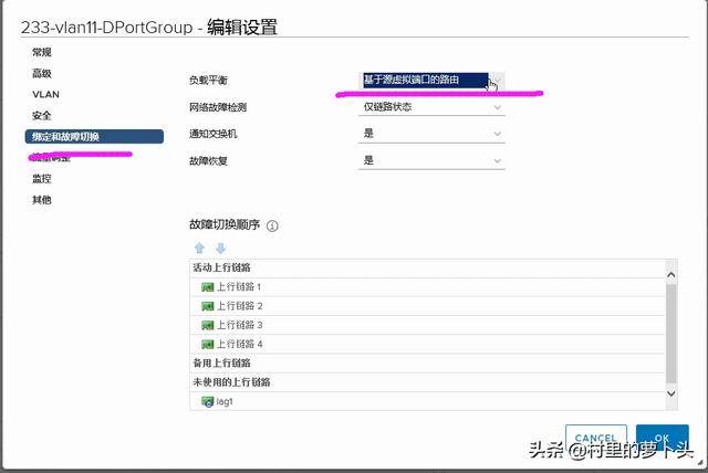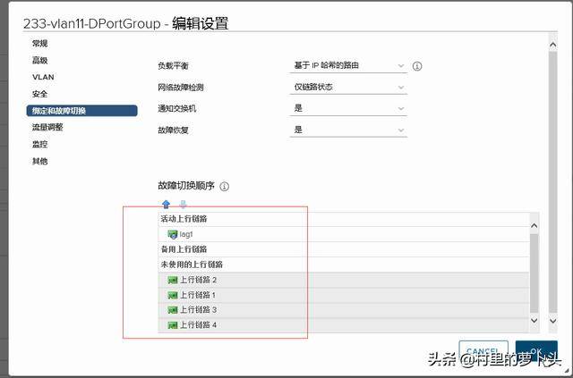 17. 在故障切换顺序,把lag1移到 活动上行链路,其余4张网卡的上行链路移到 未使用的上行链路 里面去。