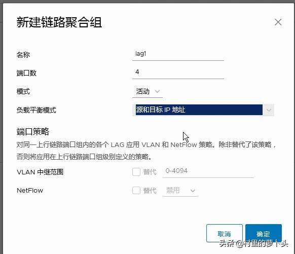 7. 新建LACP,端口数选择4,模式选择活动,负载均衡模式选择源和目标IP地址,和交换机那边一样的算法。