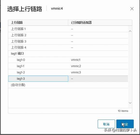 13. 选择分配上行链路,把4网卡加入lag1汇聚组当中。