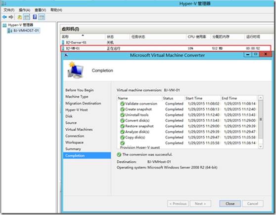 16. 等待转换完成,打开Hyper-V管理器,此时虚拟机BJ-VM-01处于运行状态