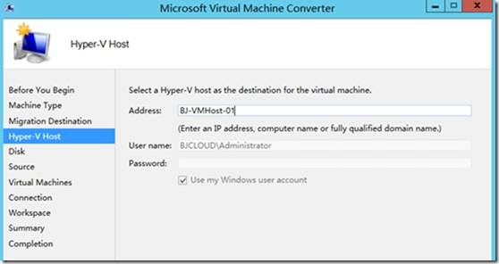 8.选择一个Hyper-V服务器作为存放虚拟机的目标主机,并键入相应用户账户和密码