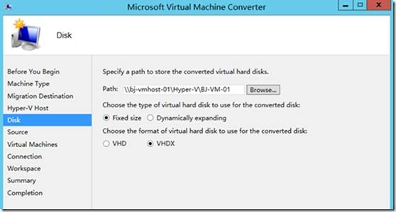 9.选择转换后磁盘存放路径,以及选择虚拟磁盘的类型,这里可以选择固定大小和动态扩展,和VHD文件的格式