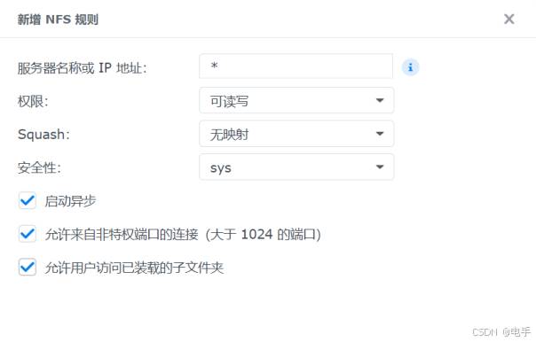 5. 填入服务名称或ESXi主机的IP地址(静态),选择读写权限等其他配置,然后单击“确定”以添加此NFS规则。