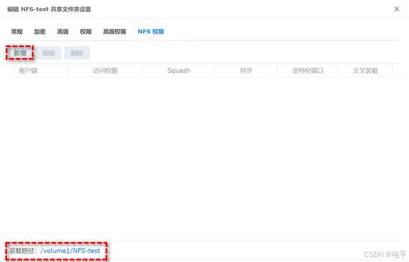 4. 返回共享文件夹选项卡,然后点击“编辑”,然后在弹出窗口中点击“NFS权限”>“新增”。