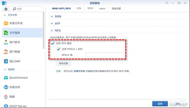 要将 NAS 存储挂载到 VMware ESXi 上,我们可以使用 NFS(网络文件系统)服务来实现。下面是通过启用 NFS 服务并使用 Synology NAS 创建共享文件夹的步骤,之后再将其作为数据存储装载到 ESXi 主机上。
