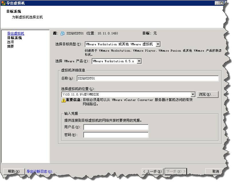 步骤二:导出虚拟机器,选择目标类型为VMware Workstation