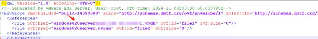 使用文本编辑器打开ovf文件,发现文件的开头位置,描述vmdk文件的地方,名字是%20 .查看文件的名字,发现是 windows server 。这里的空格被显示为URL编码了。我们尝试把%20 更换为空格。替换后报错ovf文件。之后尝试打开ovf文件,打开成功不再报错。