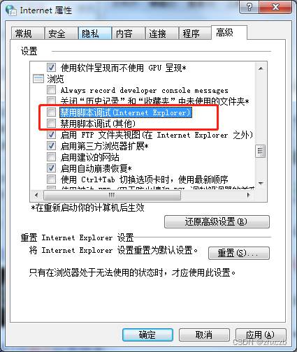 控制面板-internet属性-高级-把禁用脚本调试(IE)勾去掉