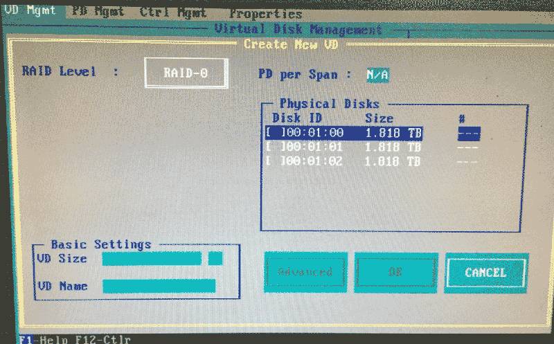由于划分RAID5后,硬盘总大小还有6TB,大于2TB不支持BIOS启动,先划分个小磁盘安装系统。