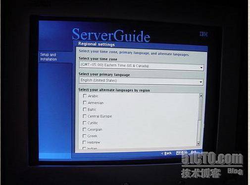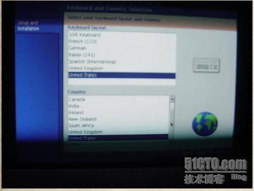 这里,是选择键盘和区域语言,直接下一步行啦,其实你真要选的话,要有心里准备,键盘当然可以选其它的,必竟它都是通用的,其实默认的也没什么,换了键盘一样使用。至于区域选择嘛,你就慢慢向下拉,再拉,再拉,拉到最下面。嗯,看到了没有?Chinese选项。找到没有?没找到?再认真找一次嘛。还是没找到?那么,,那么,,,,恭喜你,总算觉悟了,没错,它没有这个选项,呵呵,所以,就不用选什么区域了,用默认的吧。