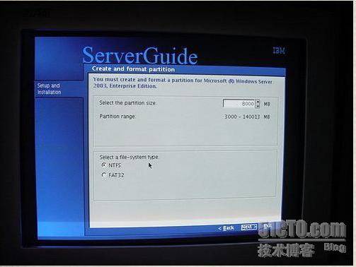 设置主分区(活动分区,也就是C盘)的大小。这里,我设了8000M,也就是8G。并且在下面的文件格式中把它改为NTFS格式。(注:一般用做服务器的系统盘空间只8G 是远远不够的,我给公司装时分40G以上的空间)