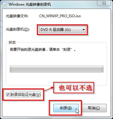 3、 此时弹出的是windows光盘映像刻录机界面,选择好自己的光盘刻录机,接着可以在“刻录后验证光盘”前打勾,最后选择“刻录”。
