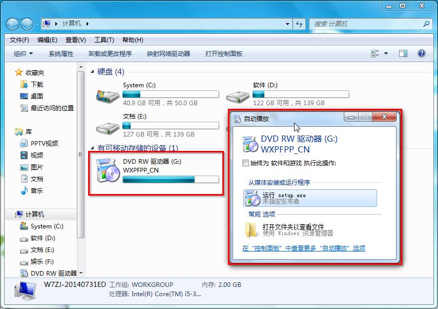 6、 大家再次把这个刻录好系统盘推进到光驱,双击“DVD RW驱动器(G)”,那么就可以看到刻录好系统光盘了。