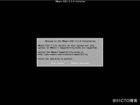 1、加载VMware ESXi 5.5.0版的ISO文件,ESXi引导装入程序,并且开始安装。按enter键,进入安装界面。如图所示: