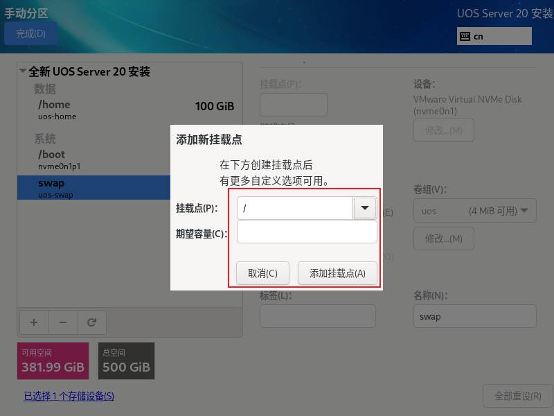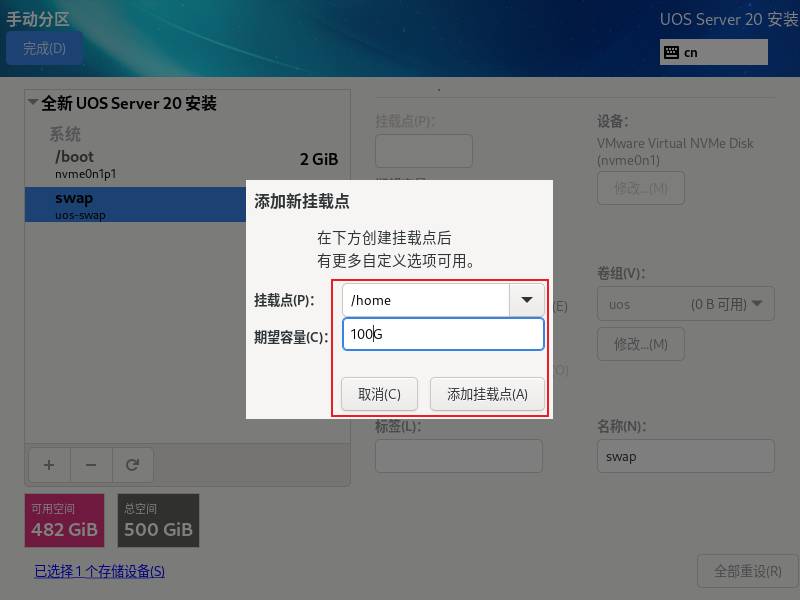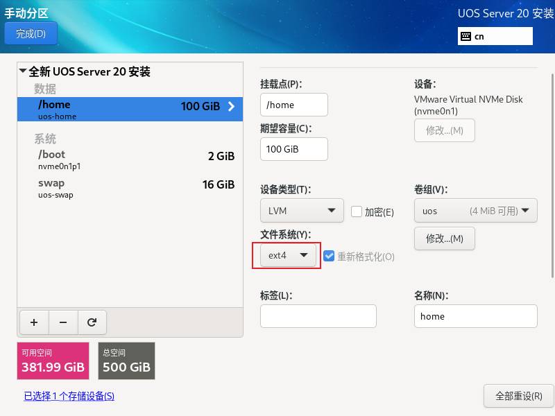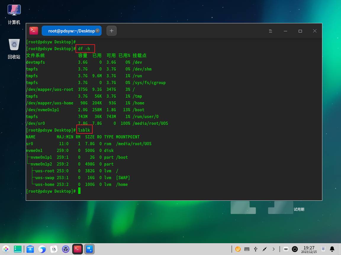 /dev/mapper/uos-home 98G 204K 93G 1% /home