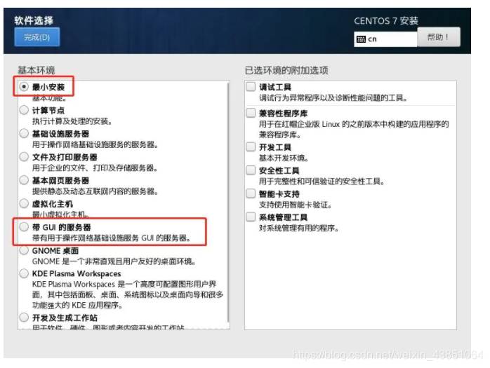 默认安装最小化安装,可以选择带GUI的服务器,就是带桌面的版本,其他附加工具自选即可。
