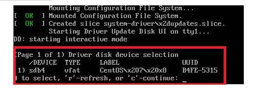 4.将配置改为vmlinuz initrd=initrd.img inst.stage2=hd…quiet改为vmlinuz initrd=initrd.img linux dd quiet。修改之后回车系统会进入磁盘设备列表,查看U盘的设备名。