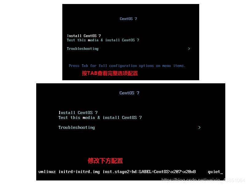 3.进入centos安装界面,按TAB键进入配置编辑(根据提示,uefi是按e键)