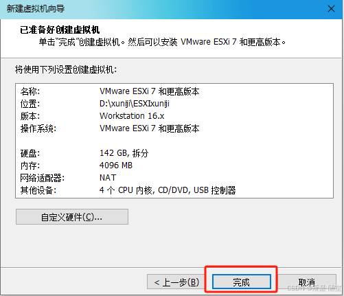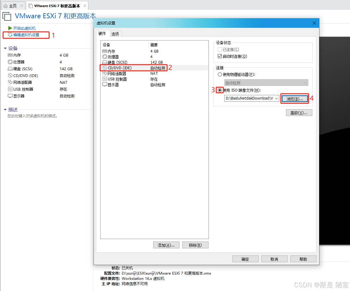 点击框选位置,选择ESXI镜像文件所在的路径,完成后点击确定,开启此虚拟机
