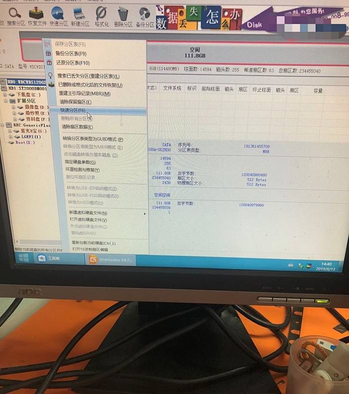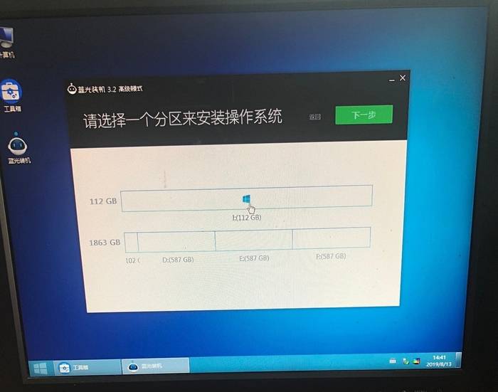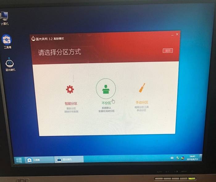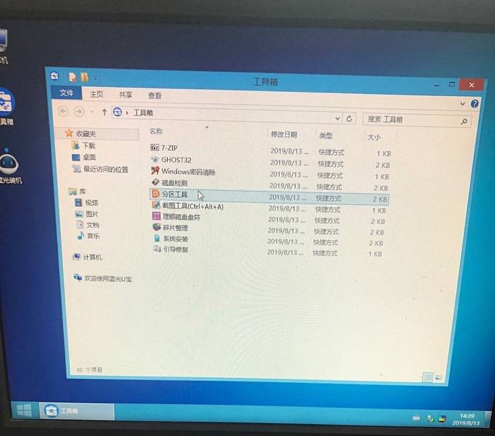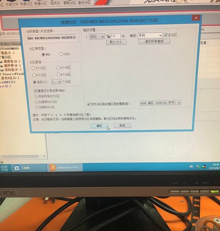 第六步:进入PE系统,首先就是分区,我们找到桌面上面的工具箱,然后选中进入下一项,在下一项找到分区工具,由于小编的固态硬盘是新的,所以不用删除所有分区了,直接就可以快速分区了,分区的时候,分区表类型是MBR,分区数目小编是选择1个,至于原因,小编之前的文章都有写过,今天在这里就不详细叙述了,然后我们再勾选4096扇区对齐,我们再点击确定就可以了。