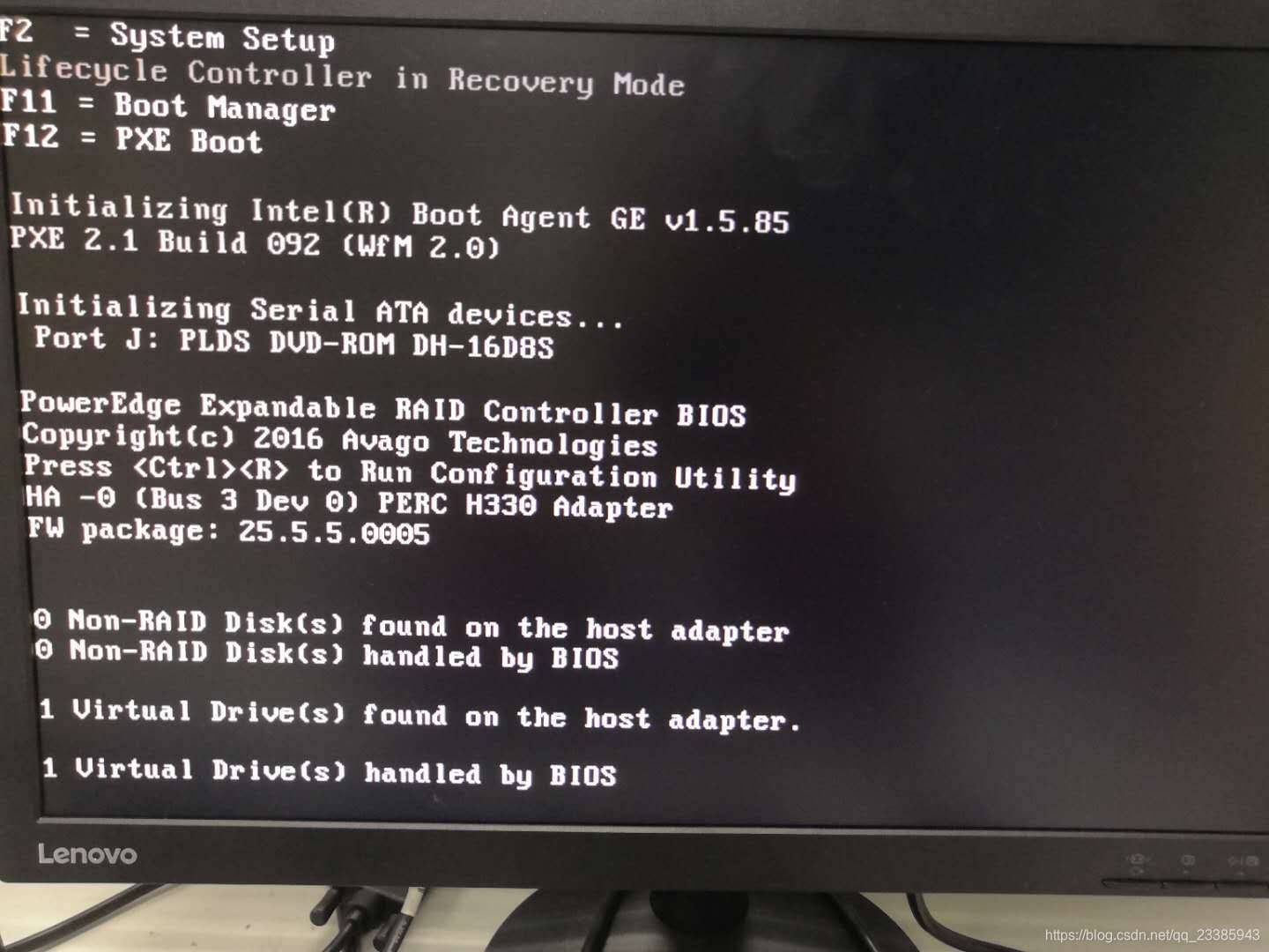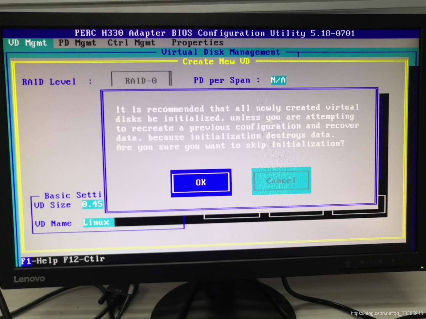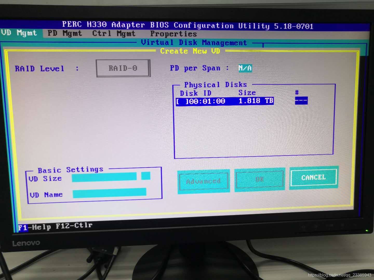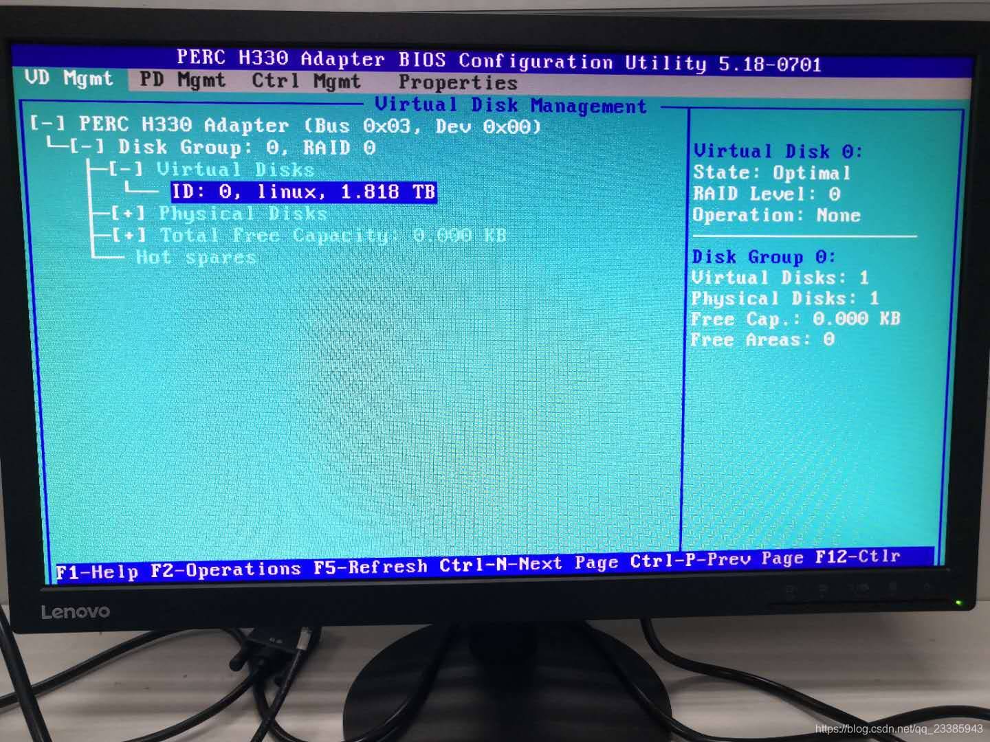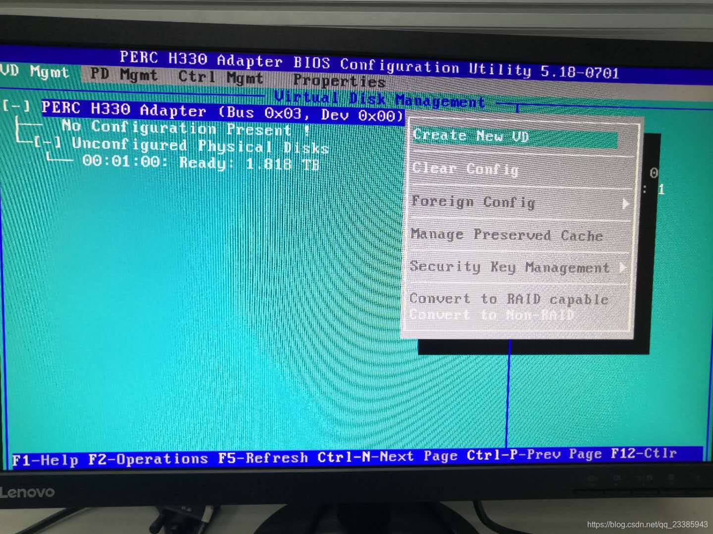 进入到VD MGMT菜单后,按“↑”到最上面的PERC H330 Adapter,然后按F2得到下图