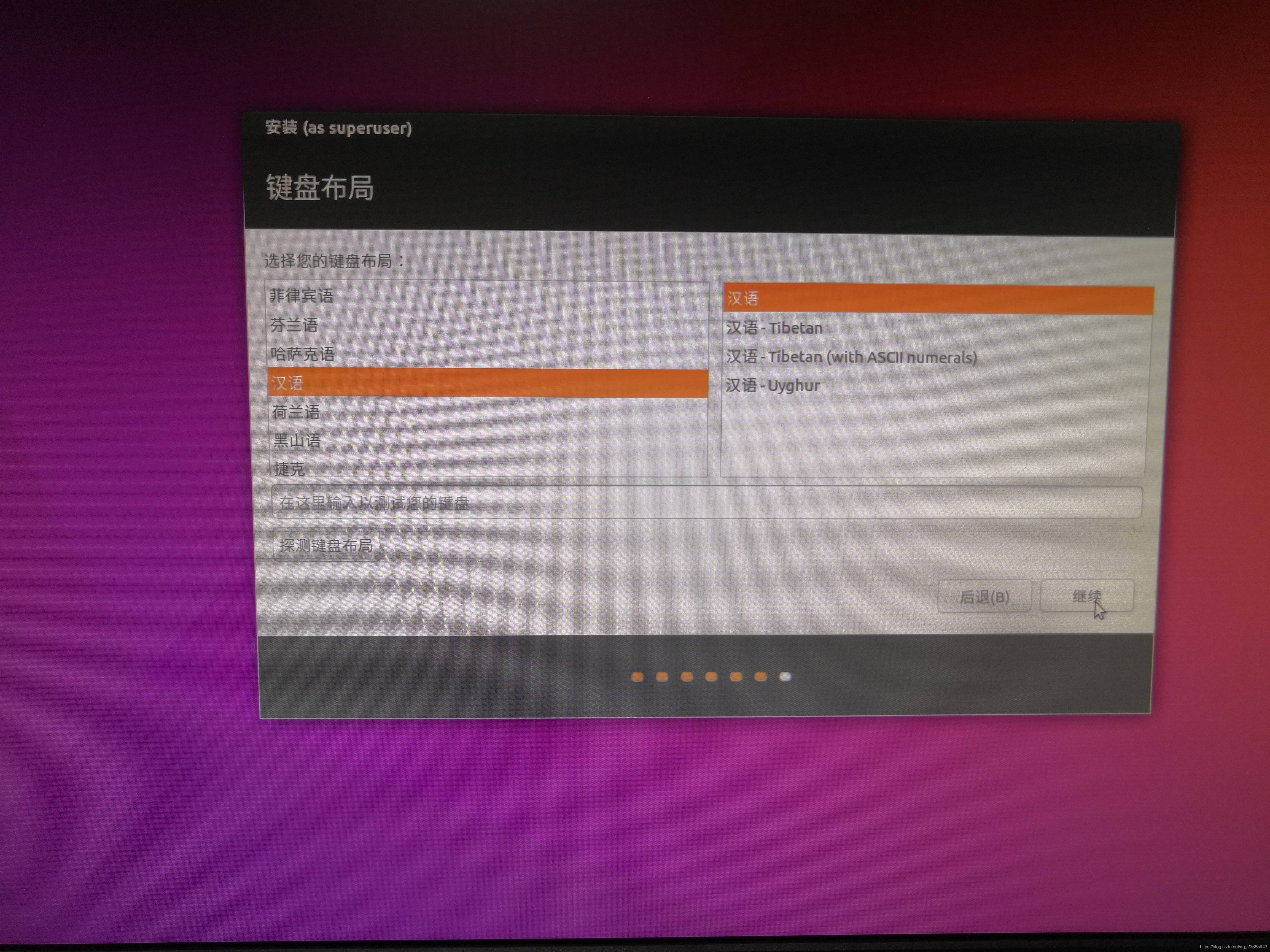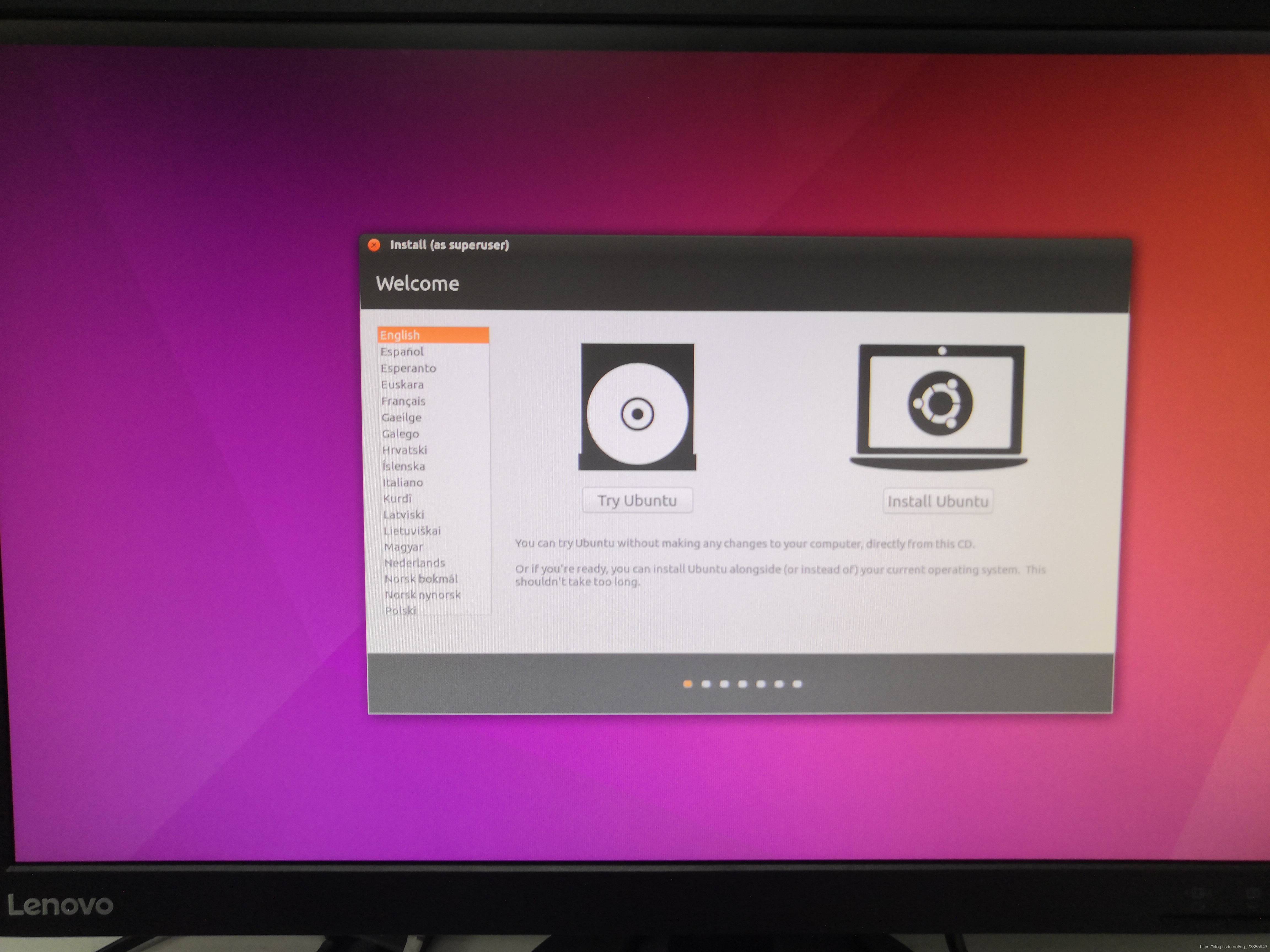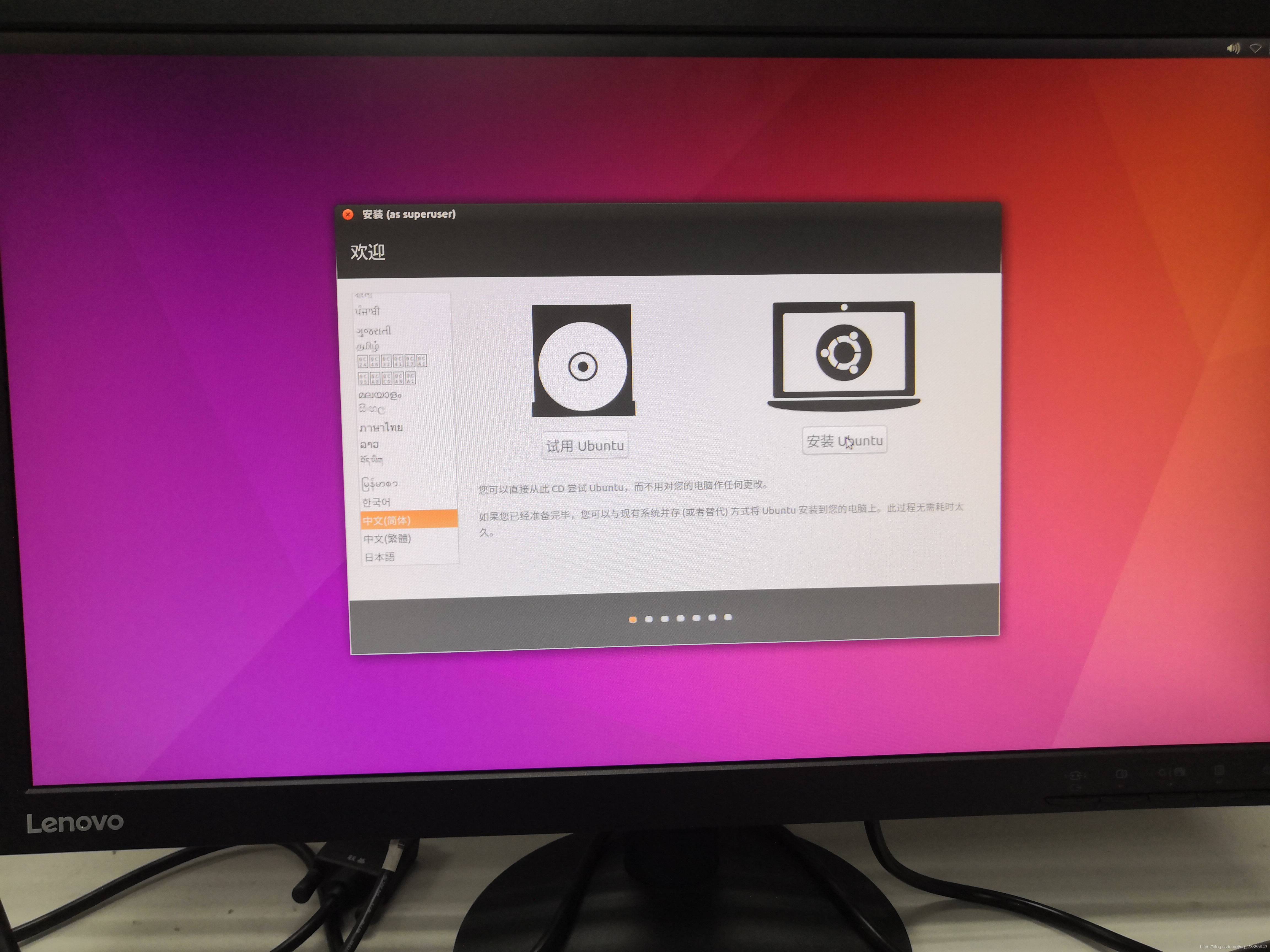 然后重启,啥都不按就到了Ubuntu系统引导安装了(这个比较简单,就跟着引导来安装就好了,这里我就不详细赘述了),如下图所示