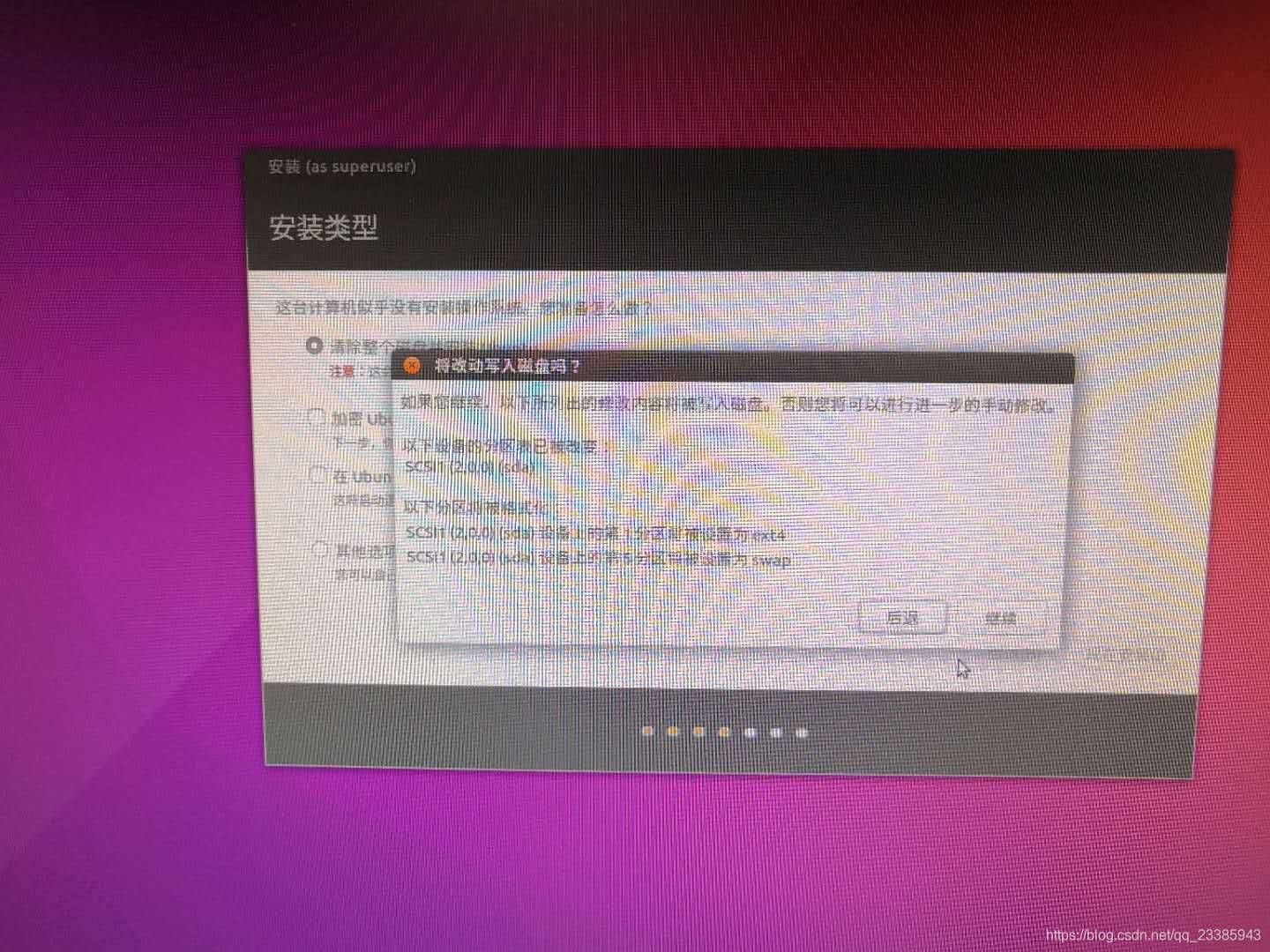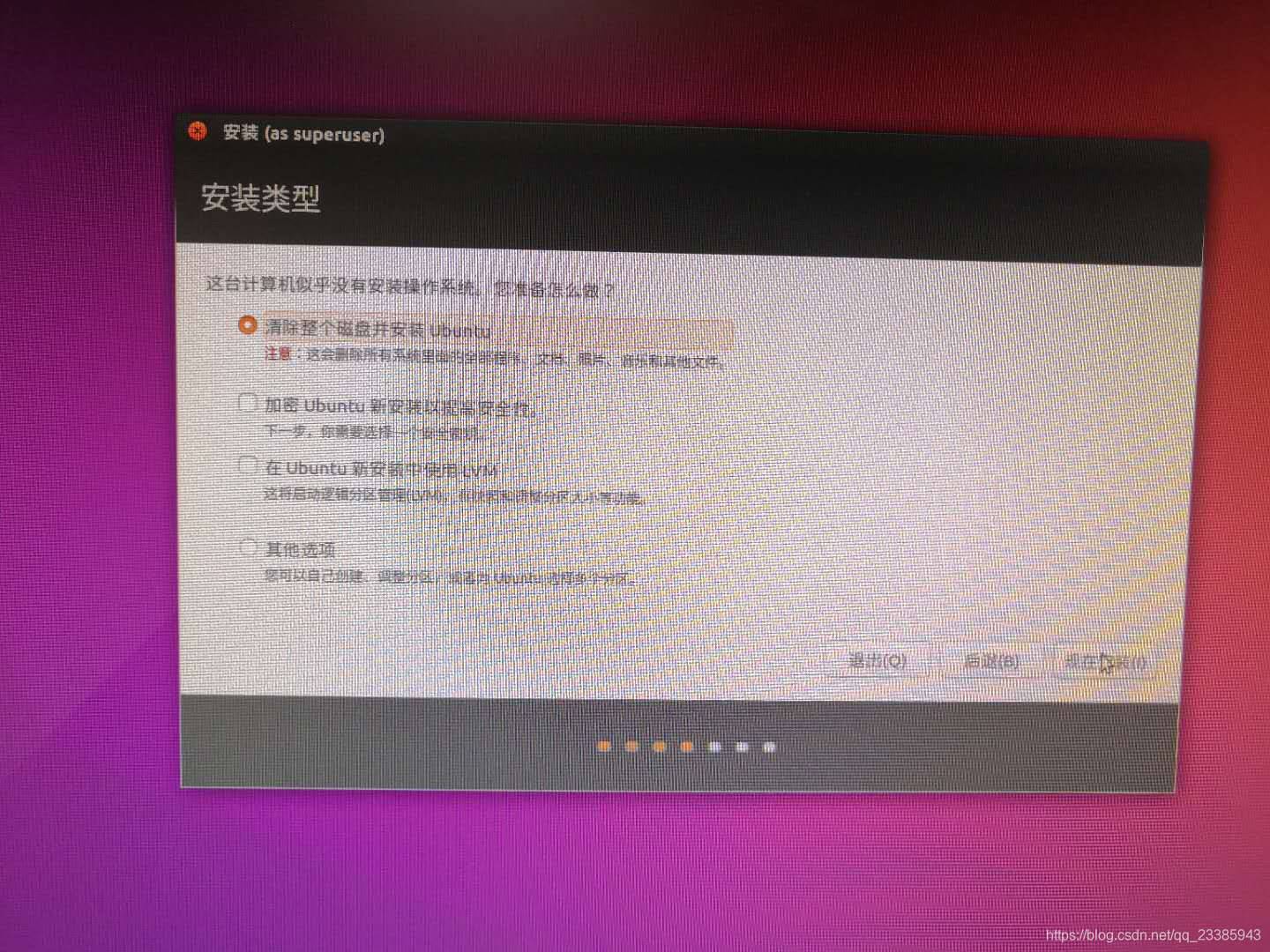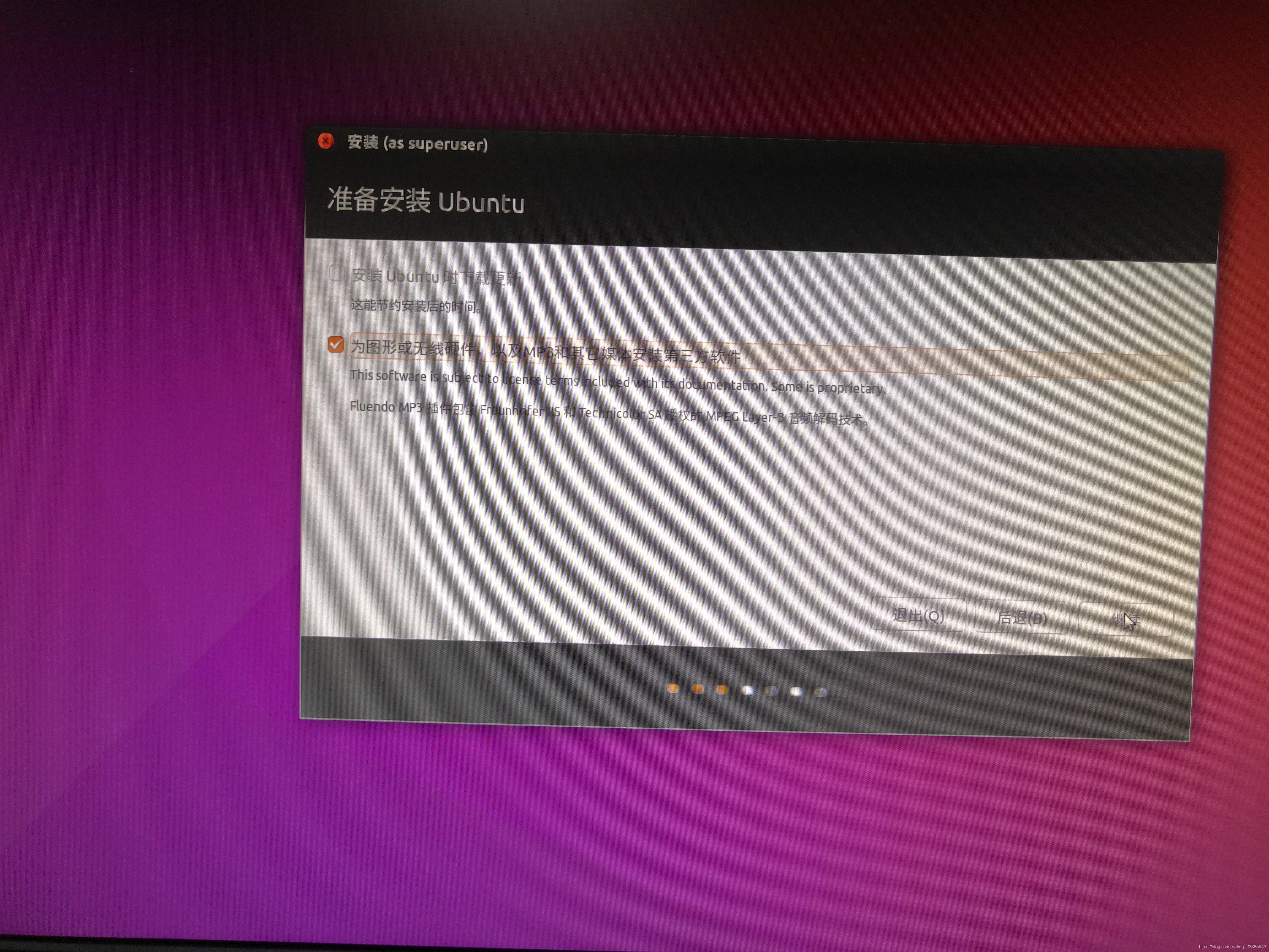 然后重启,啥都不按就到了Ubuntu系统引导安装了(这个比较简单,就跟着引导来安装就好了,这里我就不详细赘述了),如下图所示
