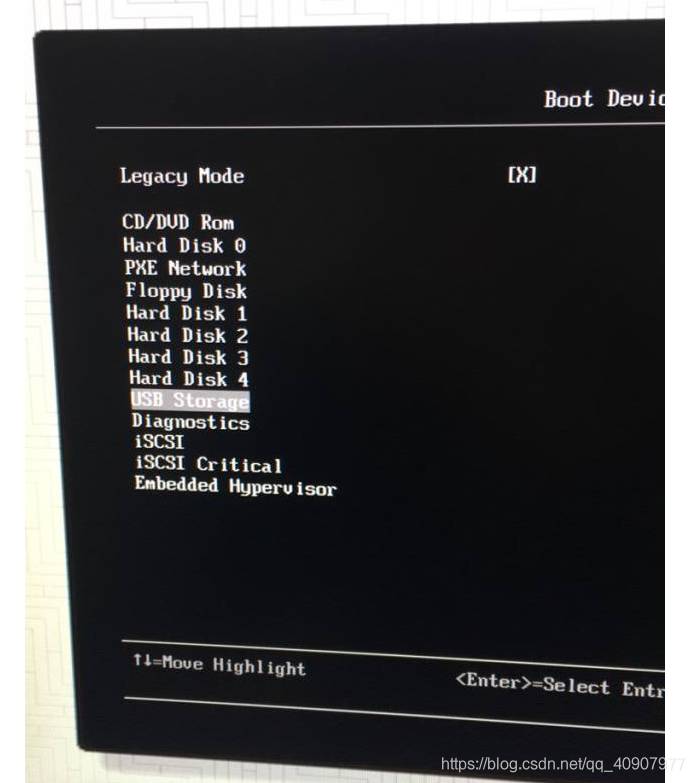 首选打开联想服务器,按下F12进去Boot启动选项,因为我们要利用U盘安装系统,所以这里选择USB storage。
