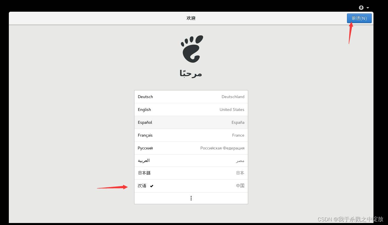 22: 接着选择汉语,输入法也选择汉语,点击前进