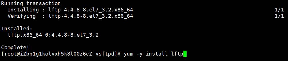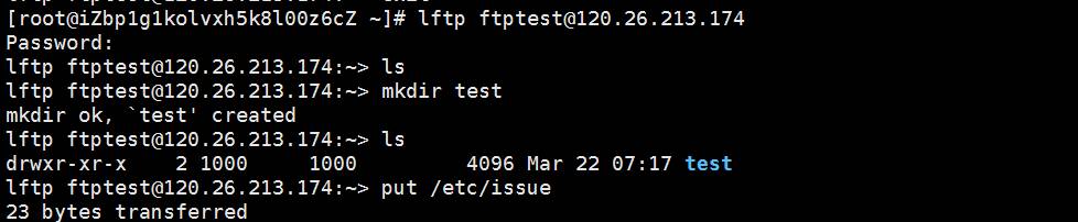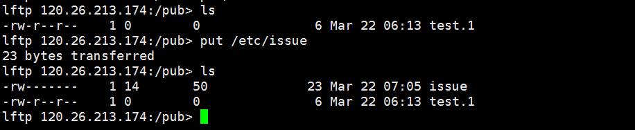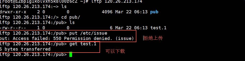 利用lftp 公网ip连接到ftp服务器,可以看到只能查看和下载,不能进行上传操作