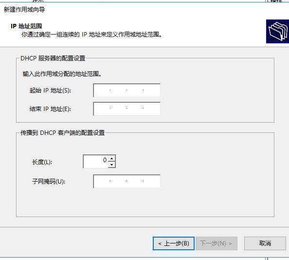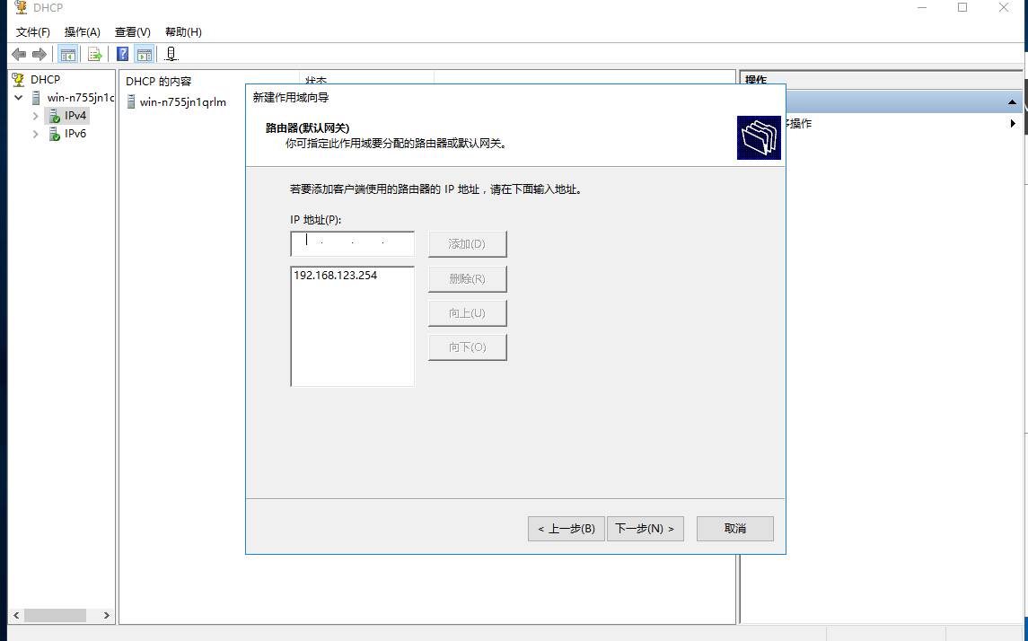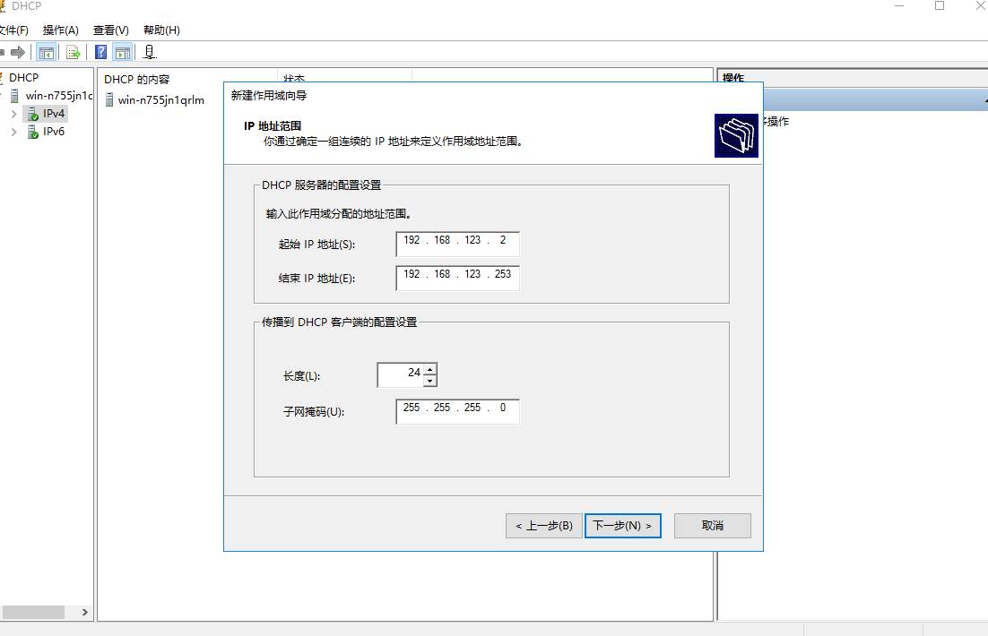 然后是输入要分配的ip起始点和结束点 注意:要和本server的静态ip一个网段我这个是192.168.123.1也就是123网段所以只能写这个网段的