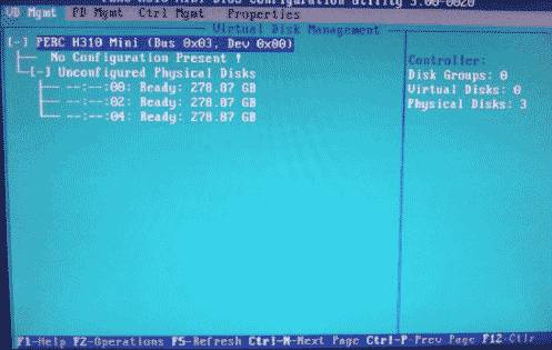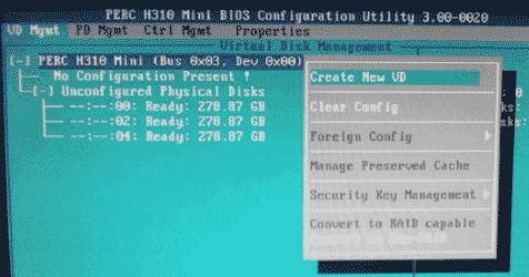 3. 此时虚拟磁盘为空,按上下键使光标停留在阵列卡型号所在行(图中的PERC H310 Mini),按F2弹出菜单,选择Create New VD创建新的虚拟磁盘,如图2-3所示: