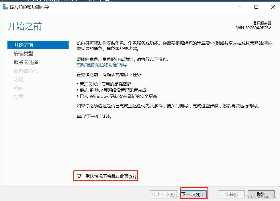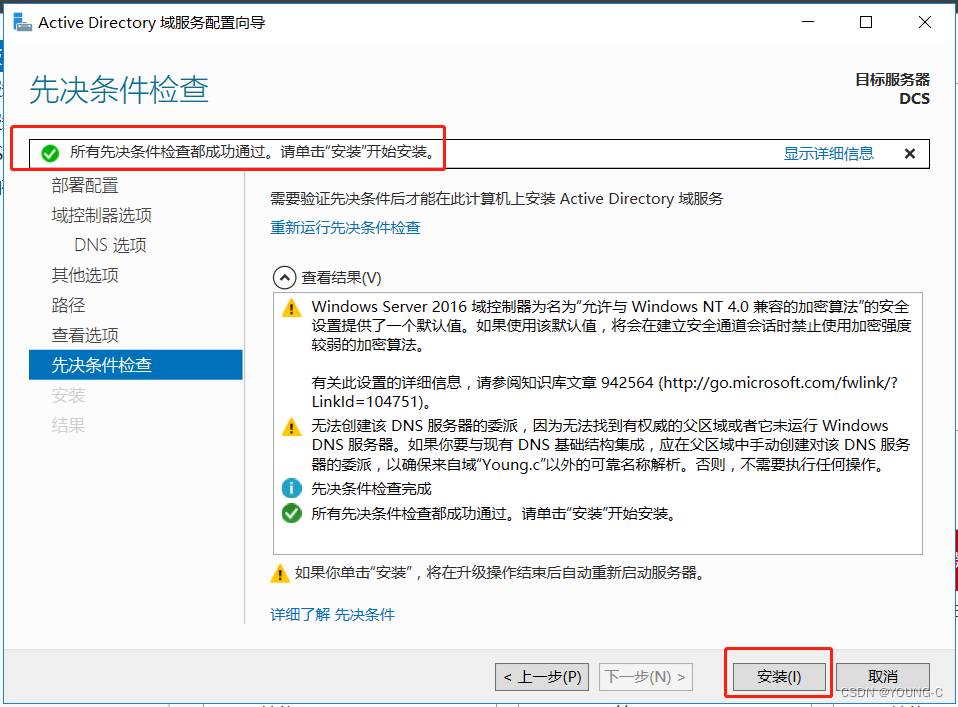 先决条件检查通过后直接点击安装,安装完毕会自动重启(先决条件警告可无视)