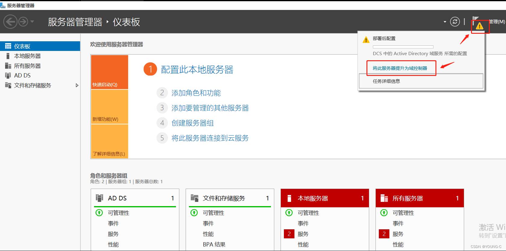 点击右上角感叹号,然后点击 “ 将此服务器提升为域服务器 ”