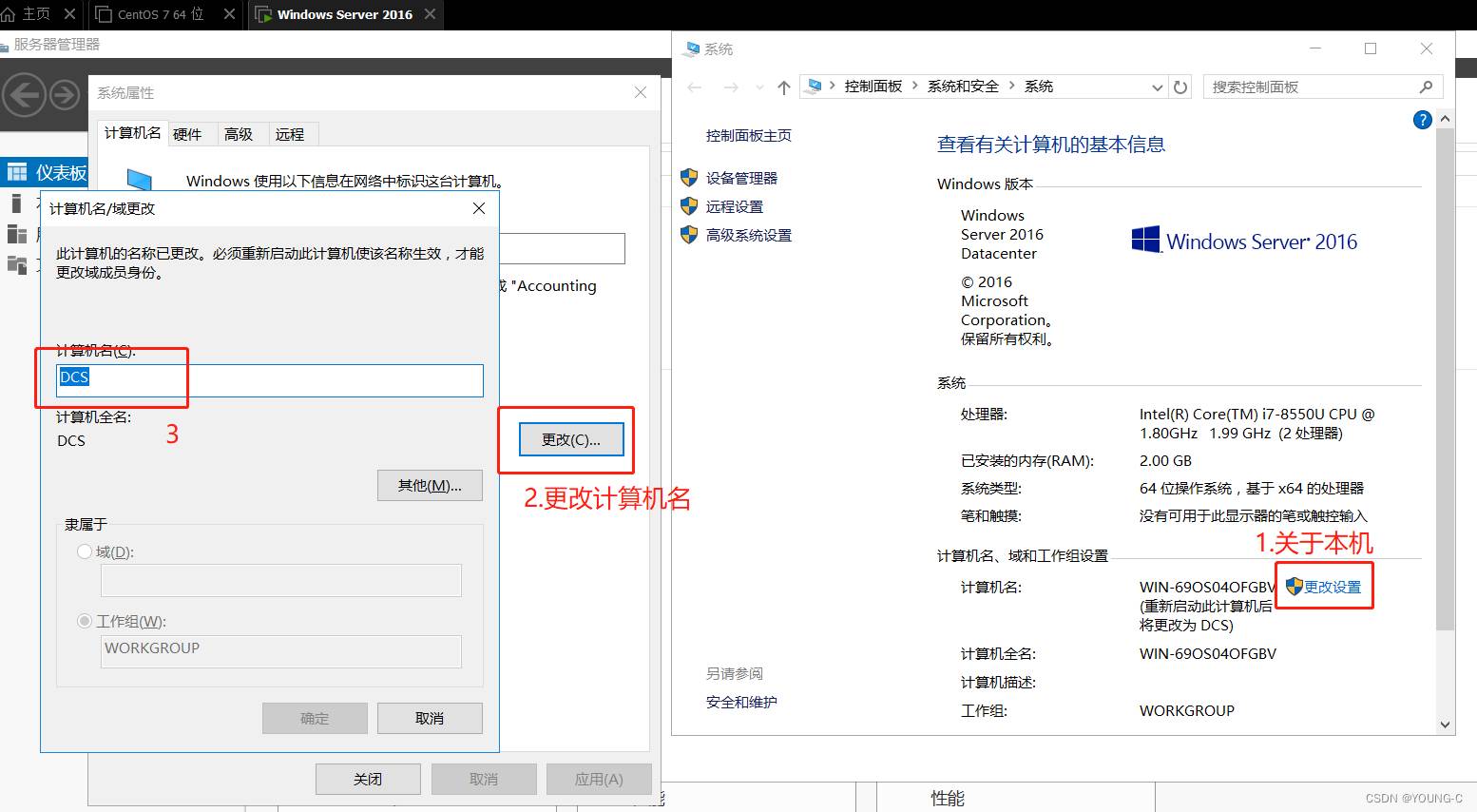 将服务器名更改为DCS(关于本机—更改设置—更改—确定—重启电脑)