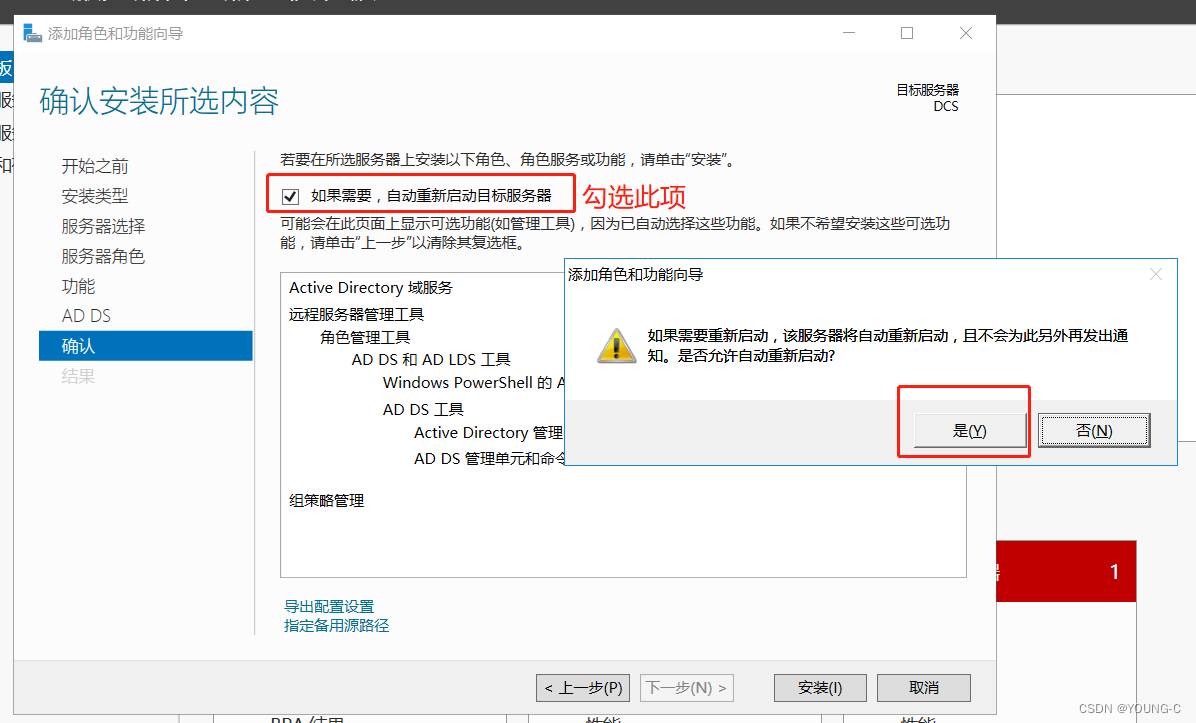 勾选“ 自动重新启动目标服务器 ” ,点击 “ 是 ” ,然后点击安装