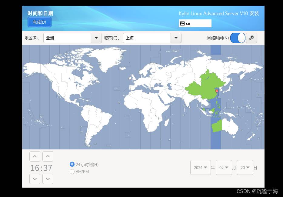 6.进入时间和日期配置,选择地区为亚洲,城市为上海,点击完成