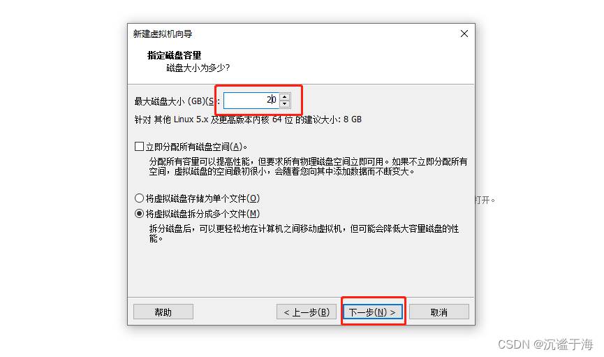 10.设置磁盘空间大小,根据实际物理空间,建议至少20G。其他默认;