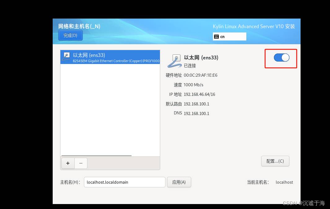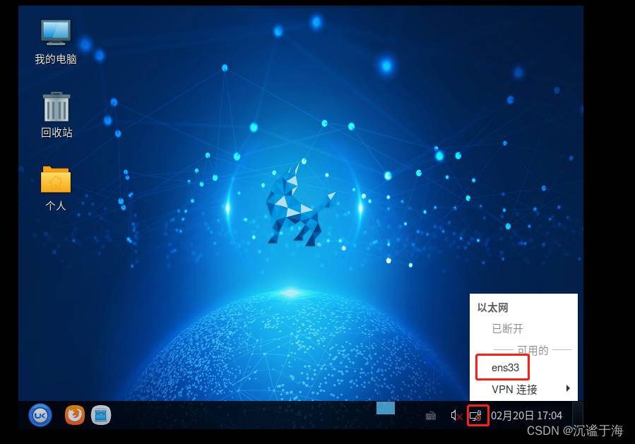 银河麒麟开机是需要手动连接网络的,点击右下角的电脑图标,然后点击ens33即可连接网络,开始使用