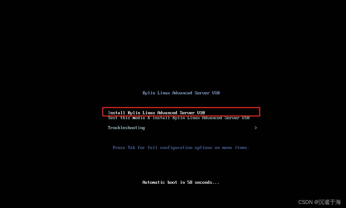 1.启动虚拟机,进入系统配置页面,选择第一个选项,进入安装页面