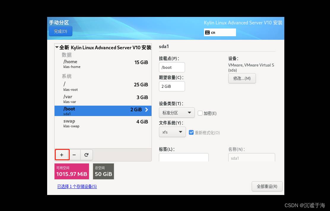 点击左下方加号即可进入配置分区页面; 以下是我根据测试需要,手动分配的相关分区大小。可根据个人实际情况增减分区.设置完成点击左上方完成