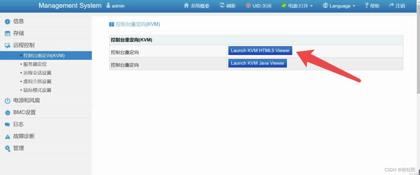 4.2.1、打开BMC控制台选择“远程控制”>“控制台重定向(KVM)”>“Launch KVM HTML5 Viewer”