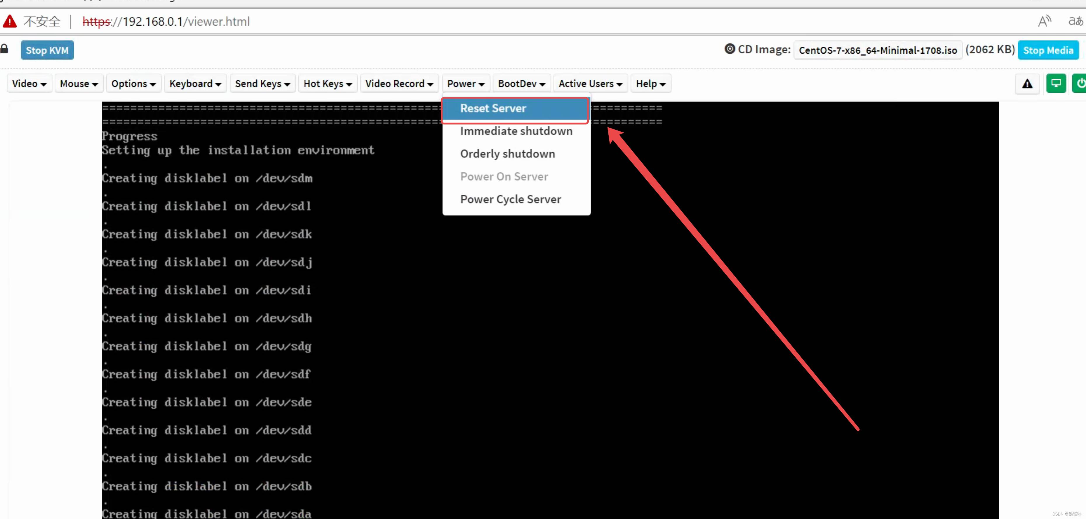 4.2.3、加载完映像,点击“Power”>“Reset Server”,重启服务器;