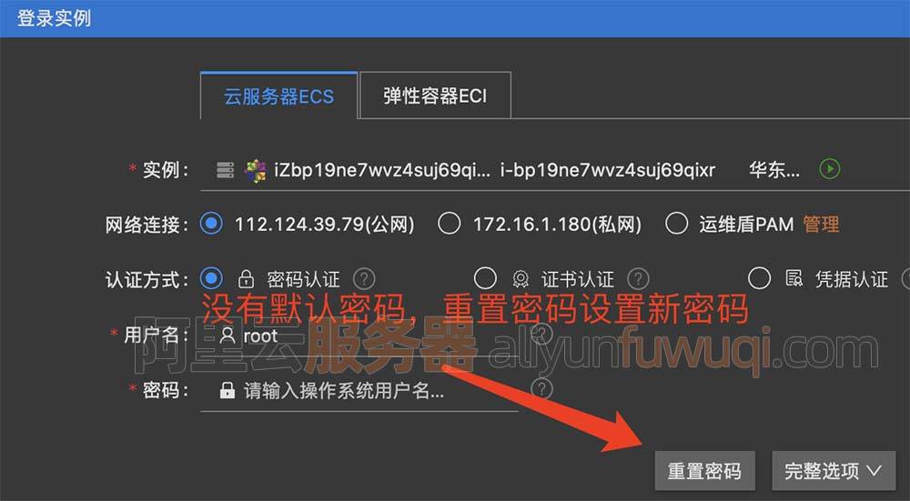 3、输入密码,点击“确定”即可远程连接,登录到云服务器上。如果购买云服务器时,没有创建密码,可以先通过重置密码的方式,来设置新密码,如下图: