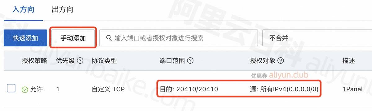 本文中1Panel默认端口号为20410,本文使用的是云服务器ECS,在安全组中开通1Panel端口。